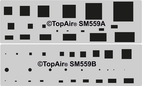 Mini-Schablonen-Set bestehend aus zwei Schablonen, 39 Rechtecke / Quadrate in verschiedenen Größen von 0,6 - 15 mm, 9 Kreise von 0,33 - 3 mm
