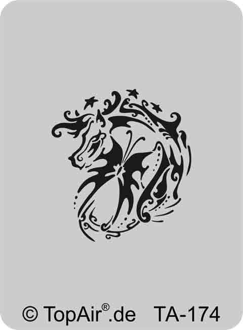 TopAir Schablone aus Kunststoff, 0,12mm dünn- zum hundertfachen Einsatz - TA-174 Fantasiepferd. Motivgröße 63 x 56mm, Schablonengröße 130 x 97mm. TopAir®-Laserschnitt, Made by Geckler ©