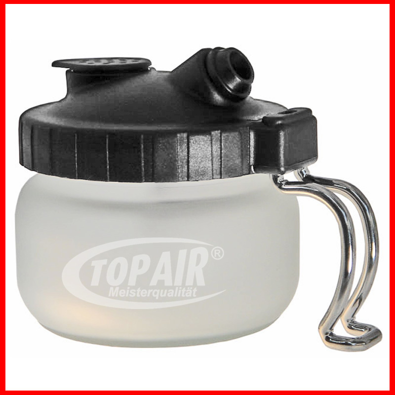 Ausspritzbehälter aus Glas mit Kunststoffdeckel zum Ausspritzen von Airbrushpistolen.