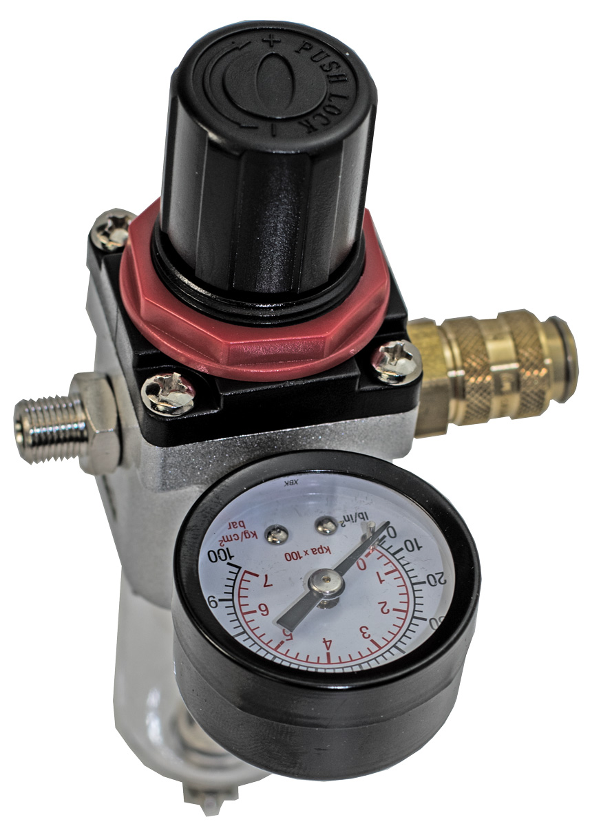 Druckminderer, Eingang 1/8" Aussengewinde, Ausgang Schnellkupplung NW 5,0 mm. Mit Kondenswasserabscheider. Diesen Druckminderer kann auf Kompressoren geschraubt werden, die ein 1/8" Innengewinde haben. Danach kann der jeweils erwünschte Druck eingestellt werden.