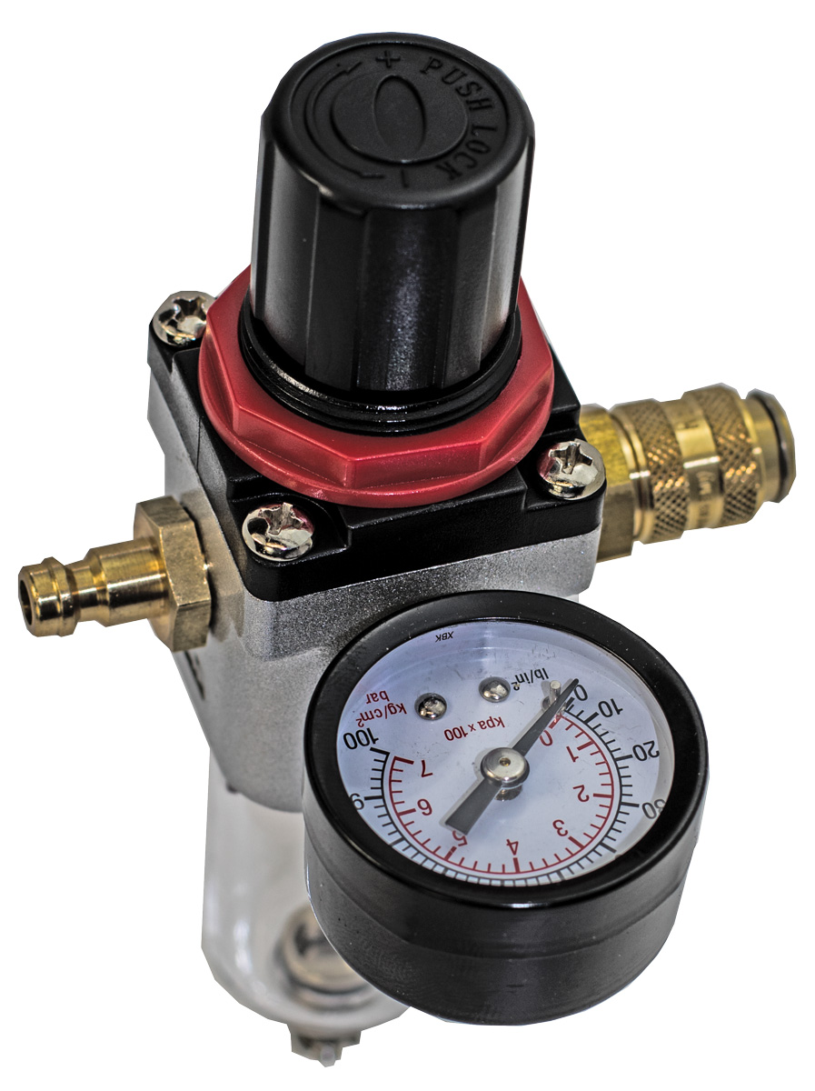 Druckminderer mit Wasserabscheider, Eingang Stecknippel NW 5,0 mm, Ausgang Schnellkupplung NW 5,0 mm. Mit Kondenswasserabscheider. Diesen Druckminderer kann direkt in Airbrushkompressoren gesteckt werden, die eine Schnellkupplung NW 5,0 mm haben. Danach kann der jeweils erwünschte Druck eingestellt werden.
