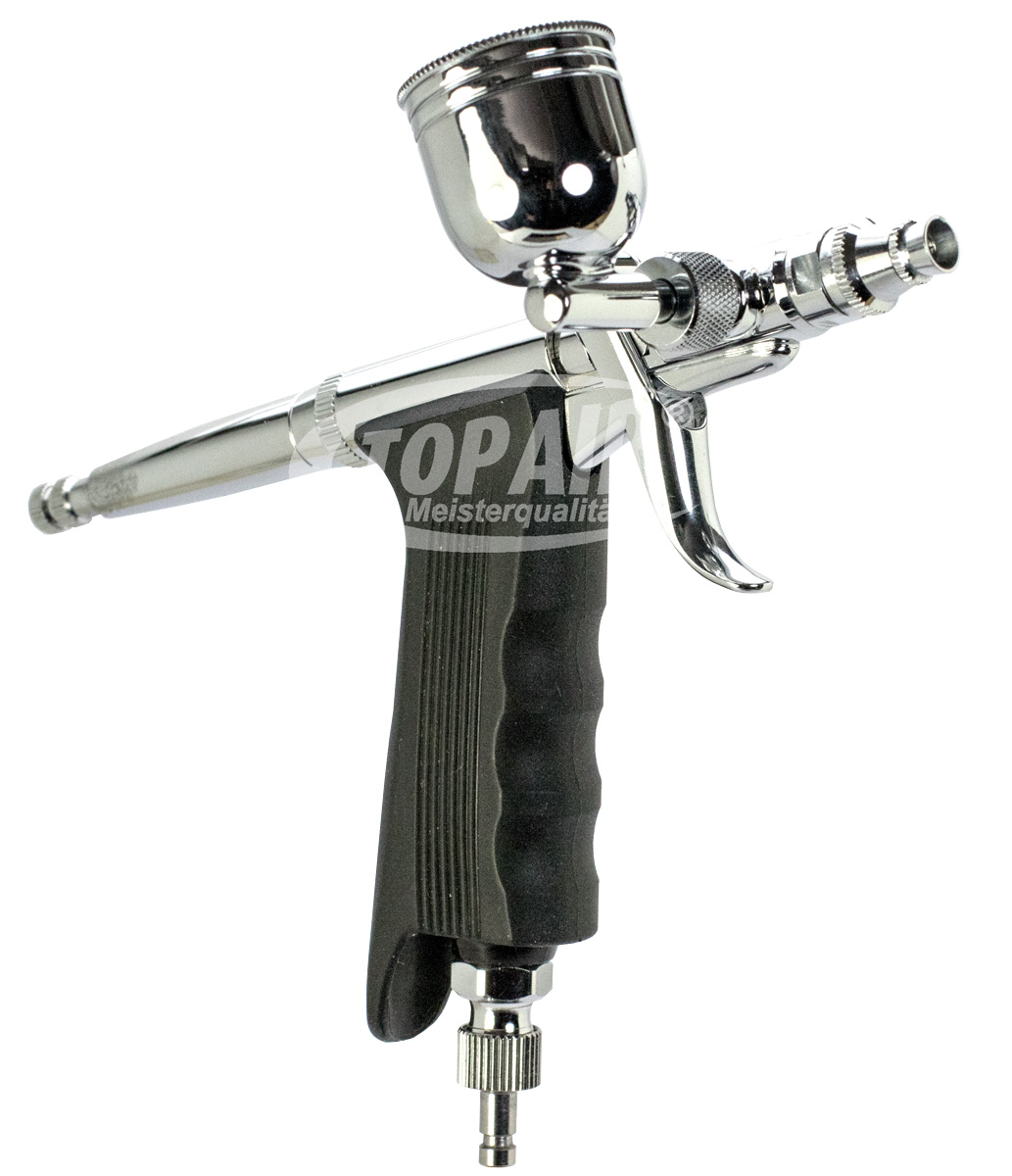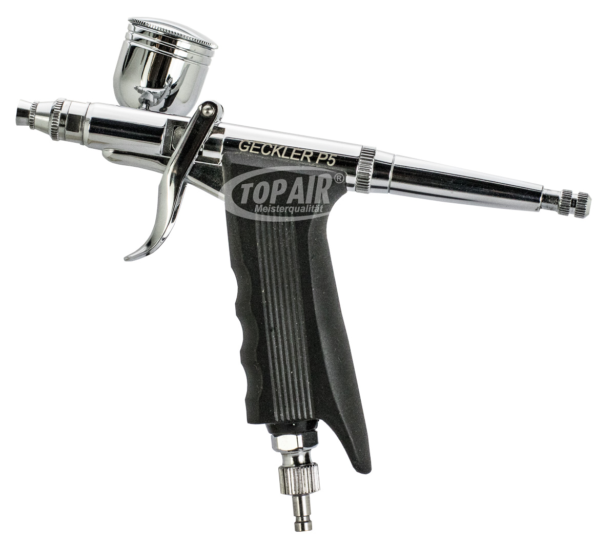 GECKLER P5, Eine Profi-Double-Action Airbrush mit 0,50mm Düse. Der 15 ml Seitenbecher mit Deckel ist auf der rechten Pistolenseite angeschraubt und kann in jede Richtung verstellt werden. . Das ergonomisch geformte Kunststoff-Handstück mit dem Pistolengriff macht diese Airbrush bedienbar wie eine große Spritzpistole. Um diese Airbrush schnell wechseln zu können ist ein Stecknippel beigefügt, welcher in Verbindung mit einer optional lieferbaren Mini-Schnellkupplung einen schnellen und sicheren Pistolenwechsel erlaubt. Standartmäßig besitzt diese Airbrush ein 1/8"-Gewinde. Durch die eingebaute Teflon-Dichtung ist die Pistole für den Einsatz mit allen wasser- aber auch lösemittelhaltigen Farben geeignet.