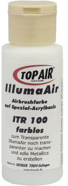 Zur Erstellung von traumhaft schönen Metallic-Farbtönen empfehlen wir folgendes Rezept: 4 Teile ITR-100 farbloses Base, 4 Teile IM-400 Metallic, 2 Teile Illuma Air Transparente Farbtöne. Die so erstellte Metallic-Farbe ergibt eine wunderbare Farbtiefe. Ferner kann z.B. eine Airbrusharbeit mit ITR-100 überzogen werden. Somit wird das Kunstwerk auf dem Weg zum Autolackierer geschützt. Zur Gerätereinigung empfehlen wir TopAir MultiCleaner oder TopAir Airbrush-SchaumReiniger Spray