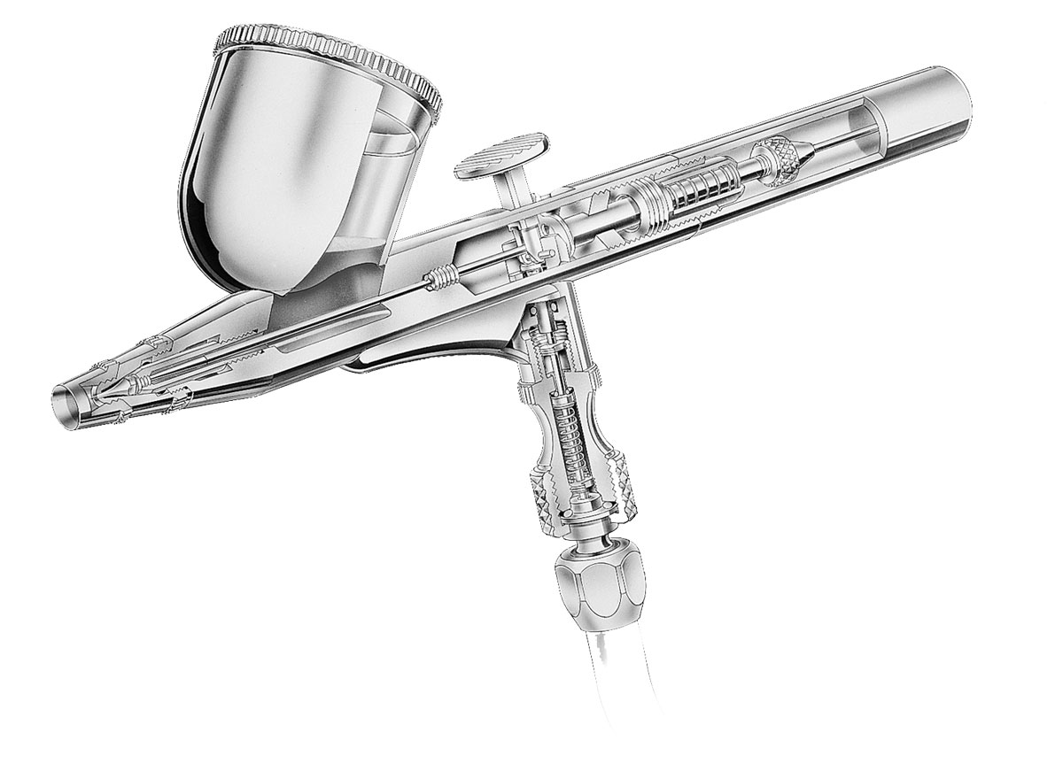 Durch den Teflon-Dichtsatz kann mit dieser Airbrush nahezu jedes feinpigmentierte Material verarbeitet werden, sowohl wasserverdünnbar, wie auch lösemittelhaltige Farben. Der 9ml-Farbbecher erlaubt von der kleinsten Menge, bis zu einer, für mittlere Flächen notwendigen Farbe einzufüllen. Der spezielle Handgriff mit Farbmengenregulierung ermöglichst bei Bedarf eine konstante Sprühstrahlstärke einzustellen. Diese Airbrush hat ein 1/8" Anschlußgewinde, aber auch zusätzlich einen Stecknippel zum bequemen Anschluß an Mini-Schnellkupplungen. Ein Düsenschlüssel, der zum Ausdrehen der Schraubdüse benutzt werden kann ist der Airbrush ebenso beigelegt, wie eine deutsche Bedienungsanleitung.