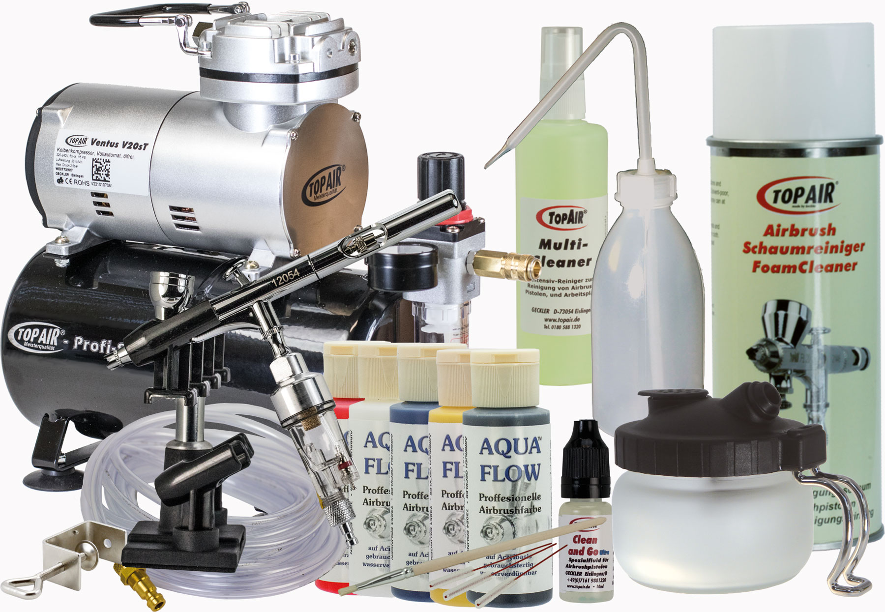 Eine komplette Reinigungsausstattung, bestehend aus: 1 x 125ml TopAir-MultiCleaner, 1 x 400 ml TopAir-Airbrush-Schaumreiniger, 1 x 10ml TopAir Clean and Go Spezialfluid, 1 Wasserspritzflasche, 2 Reinigungs-Borstenpinsel, 3 Mini-Reinigungsbürsten, 1 Ausspritzbehälter in den bei der Reinigung Farbe und Reinigungsflüssigkeit gesprüht werden kann, damit der Arbeitsraum vor Schmutz geschützt wird.