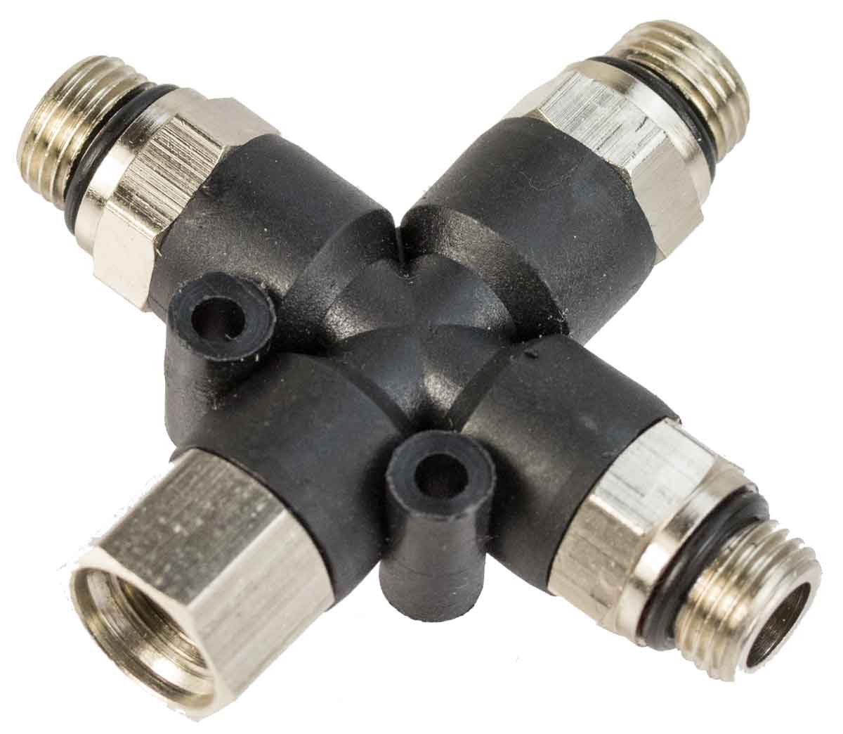 Luftverteilerblock aus Kunststoff mit 1/8" Innengewinde zum Aufschrauben auf Kompressoren mit 1/8" Aussengewinde, 3 x Aussengewinde 1/8" Metallgewinde
