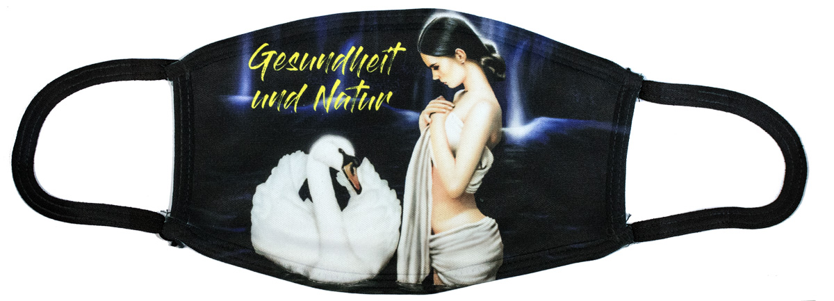 Design-Mund- und Nasenschutz. Diese Maske wird in einem Spezialverfahren bei Geckler in Baden-Württemberg manuell mit Kunstwerken bekannter Künstler veredelt. Hierbei wird die feine Kunstfaser dauerhaft eingefärbt, die Atmungsaktivität wird dadurch nicht beeinträchtigt.