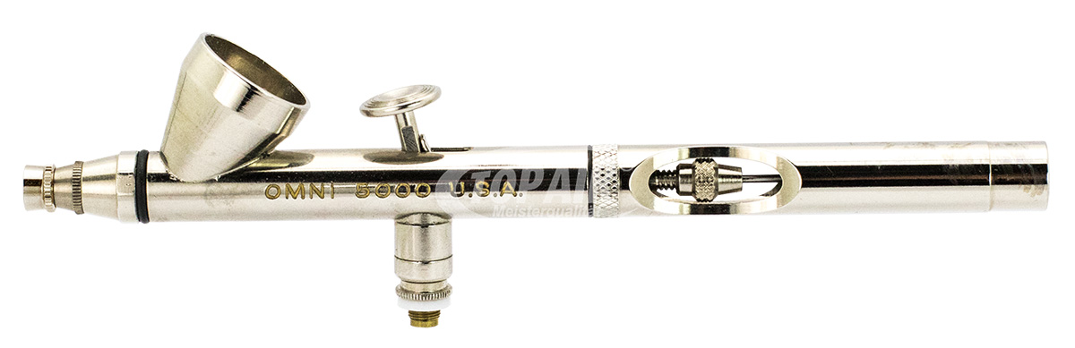OMNI 5000 Detail-Airbrush, eine DoubleAction-Fliessbecherpistole (3,5ml) mit 0,27 mm Steckdüse. Eine Weiterentwicklung der VEGA-Serie für ein noch feineres Spritzergeebnis. Um extrem feine Linien zu sprühen kann die Nadelschutzkappe entfernt werden. Dadurch kann man mit der Nadelspitze extrem nahe an das Objekt gegangen zu werden. Weiterhin sieht man sofort, wenn sich Farbe an der Nadel festsetzt und diese kann sofort von der Nadel abgelöst werden. Ursprünglich von Thayer & Chandler entwickelt war sie in den USA die Top-Airbrushpistole. Eine beliebte, gute, aber einfache Airbrush. Die Airbrush hat einen 5mm-Luftanschluss. Ein Düsenschlüssel zum Öffnen der Kopfeinheit ist beigefügt.