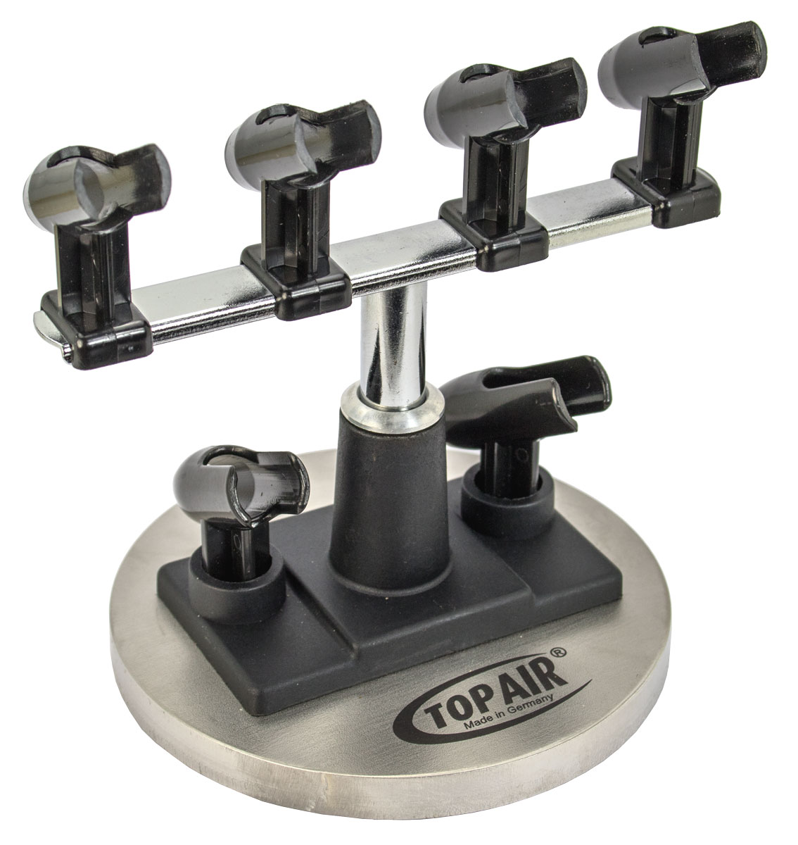 Die neuen TopAir®- FineLine-Airbrushes mit den Luftregulierungsschrauben (FL20 + FL 30 ) passen hervorragend in diesen Halter. Dieser Halter ist ideal für alle Fließbecherpistolen, auch für IWATA HiLine-Serie.