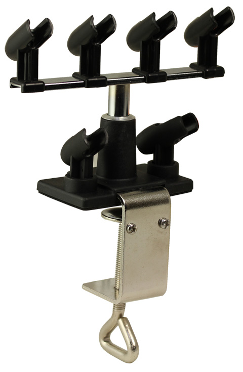 Einfach den Halter mit der mitgelieferten, verchromten Klemmzwinge an der Arbeitsplatte festschrauben und die Pistolen in die Kunststoffköcher einstecken.